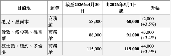 根據亞洲萬里通最新公佈的里數表,2026年5月1日00:00(香港時間)起,部分航線的兌換里數將再度上調。最值得注意的變化如下: