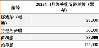 值得留意的是,短途航線如曼谷、上海、新加坡的特選經濟艙及商務艙反而略有下調,分別由20,000降至18,000里、28,000降至27,000里,形成明顯的結構性對比——短途往下調,長途往上推。畢竟短途航班的商務艙需求沒有長途航班大。