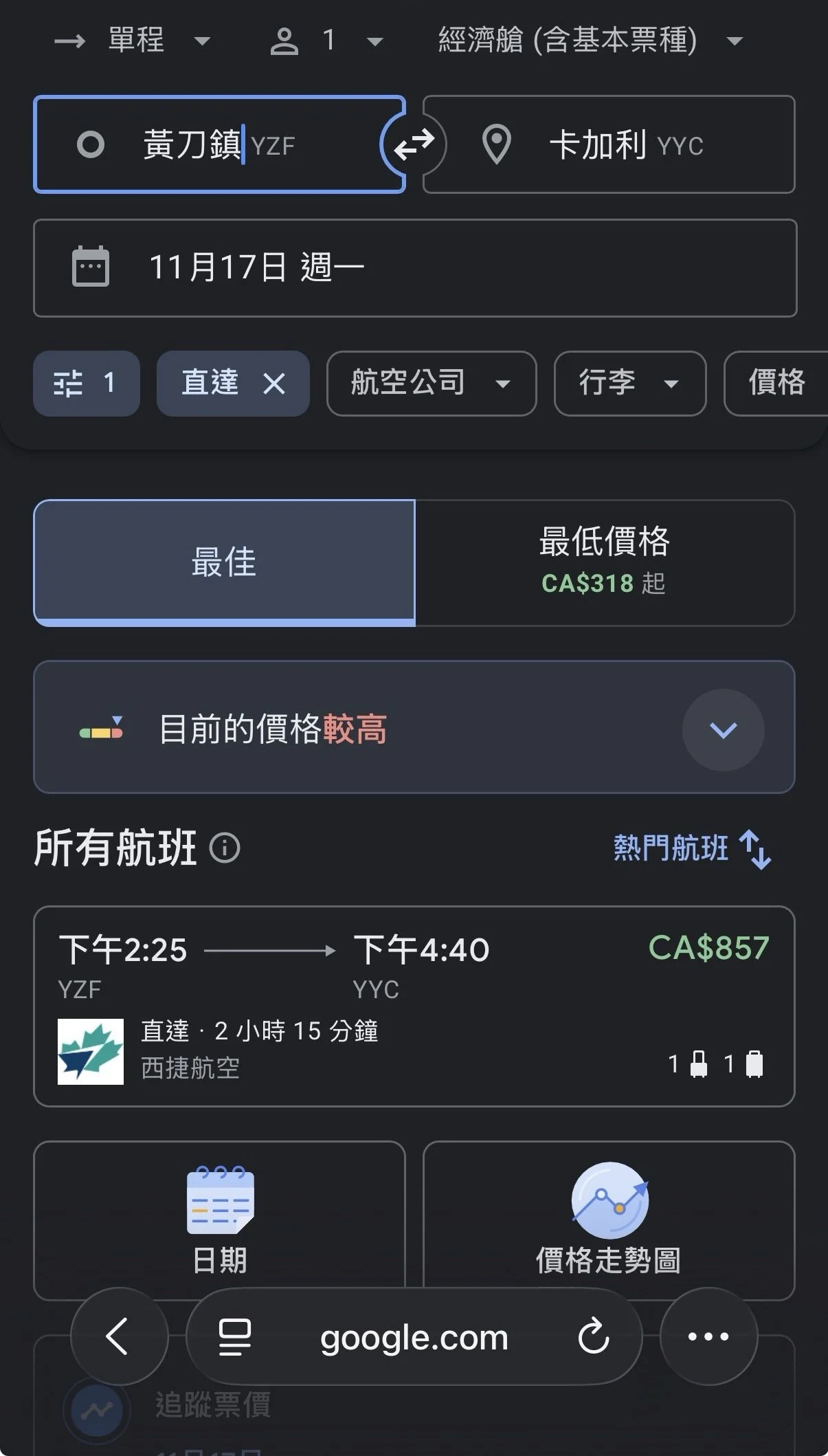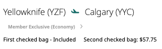 根據出發的時間以及搜索機票的時間,加拿大內陸航班價格可以相差甚遠。在臨近出發前2周搜索從黃刀鎮Yellowknife (YZF)飛到卡加利Calgory (YYC)的Westjet 航班,Google Flight結果顯示,加配一件23KG 行李索價CAD 857. (當然如果提早半年搜索機票可能便宜許多)