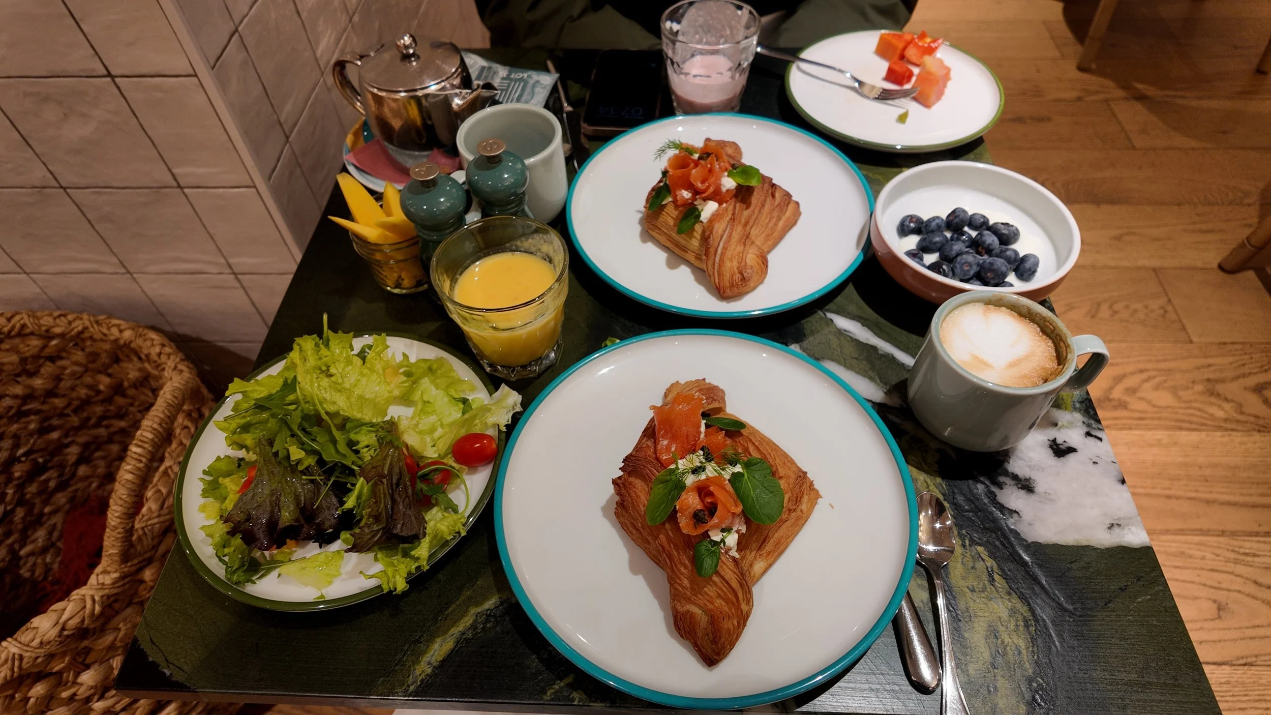 這次訂的是含早餐的房價,餐廳就在酒店主樓內。Fairmont 的早餐採半自助形式——有豐盛的自助選擇(新鮮果汁、麵包、煙燻三文魚等),同時可以從菜單點選一道主菜,我點了三文魚danish ,層次豐富的酥皮配上煙燻三文魚及忌廉芝士,是非常滿足的早晨選擇。
