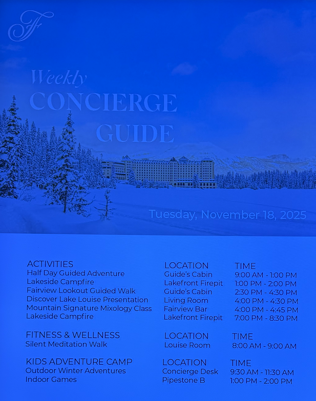 Fairmont Château Lake Louise 的另一個特色,是它以 Resort 形式運營,酒店每週都會安排豐富的活動讓客人參與。可以參考酒店內的 Weekly Concierge Guide,就可以看到有什麼活動可以參加——無論是戶外冒險、文化體驗還是靜心活動,選擇之多讓人驚喜。